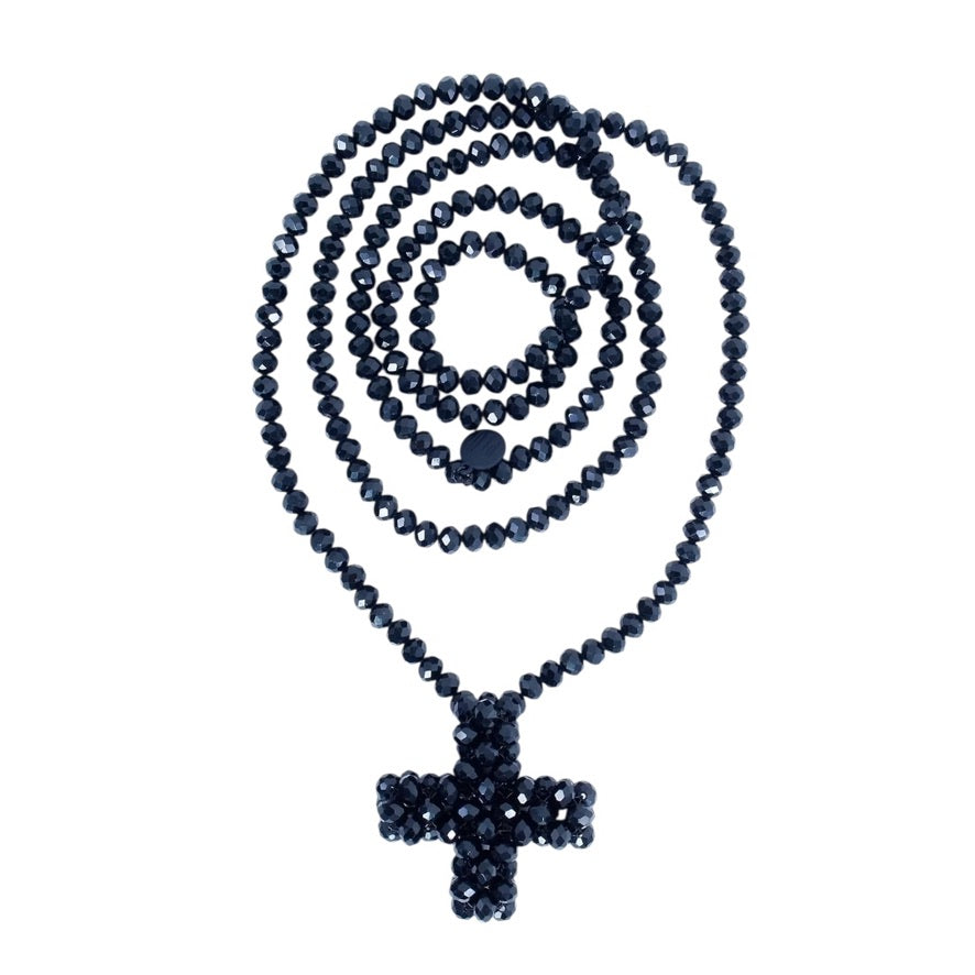 Elegante lange schwarze Perlenkette mit funkelndem Kreuzanhänger – ein stilvolles Accessoire für jeden Look - PLÜ